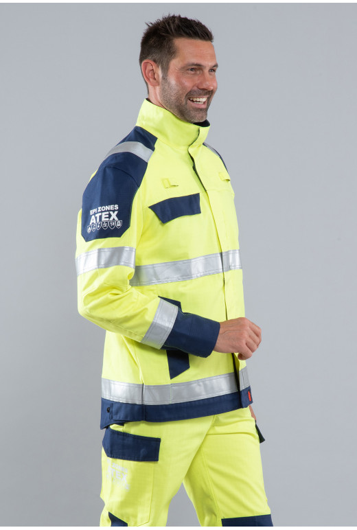 - 5 cm grey fire-retardant retroreflective stripes applied twice around the torso and arms and on the shoulders