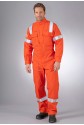 - Bandes rétroréfléchissantes ignifuges grises de 5 cm posées sur le tour des bras, le tour de mollets et en forme de baudrier dos-devant